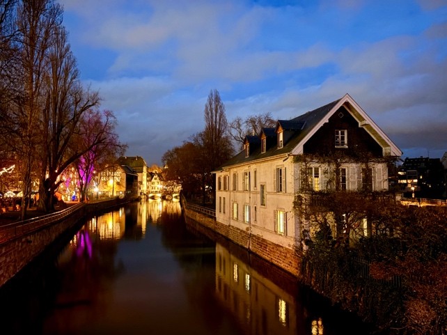 Mit einem Abendspaziergang durch die weihnachtlich beleuchtete Stadt, die sich in der Ill spiegelte, ging es mit müden Füßen nach Hause.